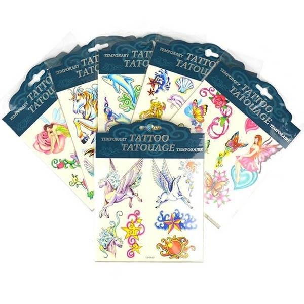 Zmywalne i bezpieczne tatutaże o tematyce związanej z wróżkami : konie, różdżki, serca, motyle, jednorożce itp. Na każdym z arkuszy znajdują się różne, duże wzory tatuaży.