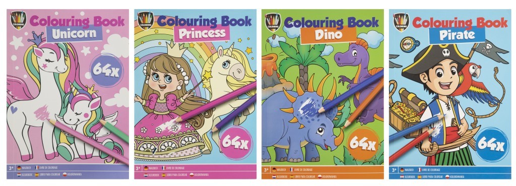 - Typ obrázků: omalovánky s různorodými motivy (Jednorožec, Princezny, Dino, Piráti)