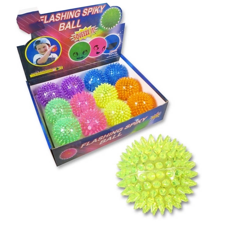 Míček masážní se světlem a s ostny v 6 barvách s průměrem7,5 cm, po stisknutí píská, po úderu přerušovaně barevně svítí.Cena je za kus.