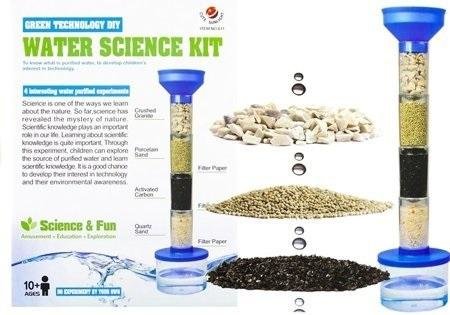Zestaw Doświadczalny Filtracja Wody Filtr Piaskowy 4 Warstwy Zestaw naukowy, dzięki któremu dzieci mogą poznać proces oczyszczania wody, cieczy metoda filtracji na filtrze piaskowym. Woda podczas filtracji będzie przechodziła przez poszczególne warstwy piasku, ulegając procesowi oczyszczenia - filtracji. Woda przechodzi najpierw przez piasek o największej frakcji do najmniejszej Całość zapakowana w kolorowe pudełko idealnie nadaje się na prezent W skład zestawu wchodzi: - filtr - 6 woreczków z materiałami niezbędnymi do przeprowadzenia procesu filtracji (kruszywo granitu, granulki piasku, węgiel aktywny, piasek kwarcowy, saletra, glinian potasu) - 6 papierowych sączków - 2 gąbeczki Zestaw po złożeniu osiąga wymiary: 28 cm x 5 cm