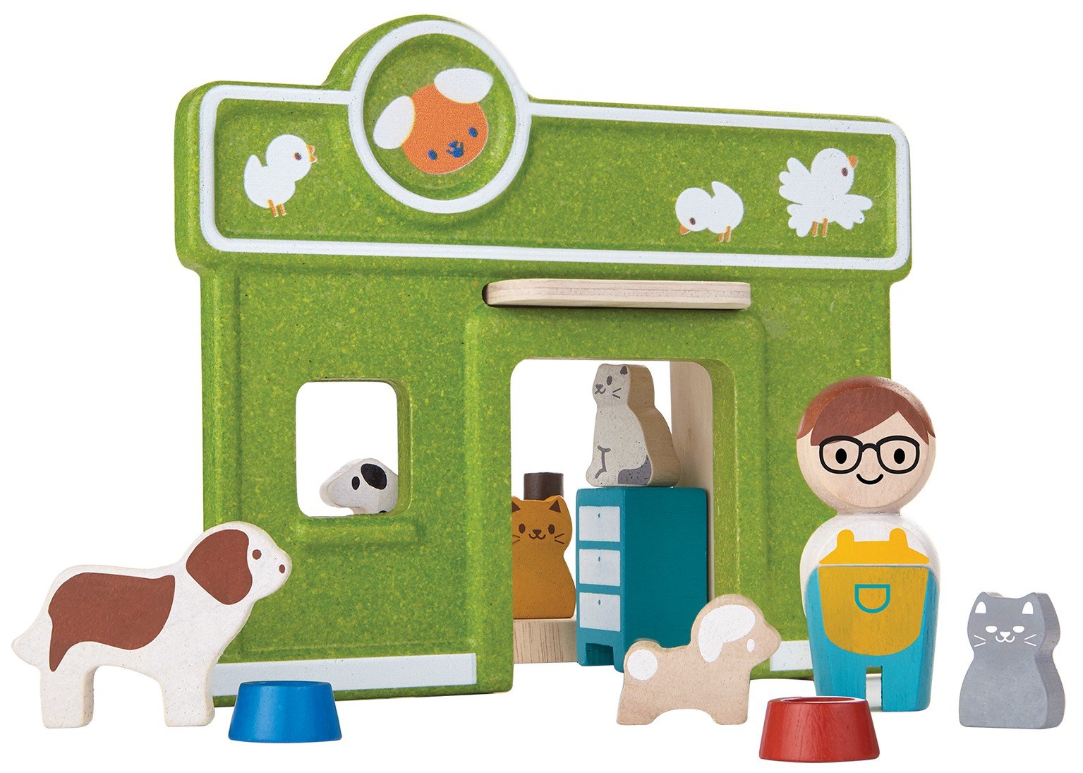 Zelená veterinární klinika z kaučukového dřeva se skládá z jednotlivých dílků, které lze několika jednoduchými kroky sestavit dohromady. Přední část zobrazuje stavbu, zadní dílky pak představují ordinaci. Součástí sady jsou i postavičky zobrazené na fotografii! Vhodné jako doplněk k Plan Toys vláčkodráhám, nebo jako součást pro vybudování města při koupi dalších budov (farmy, obchodu, pekárny, hasičské stanice a dalších). Rozměry: 16,0 cm x 7,5 cm x 13,5 cm Vhodné pro děti od 3 let.