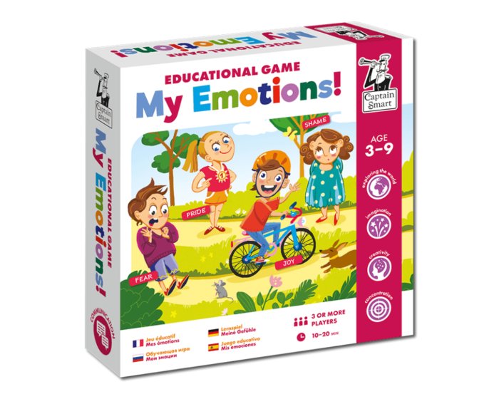 Captain Smart - Moje emoce je nejen zábavná alternativa k digitálním hrám, ale zároveň nabízí praktické nástroje k rozvoji koncentrace a dalších dovedností důležitých pro život ve 21. století. Sada obsahuje 10 karet aktivit, 10 karet emocí, 20 žetonů emocí, 18 žetonů skóre a 4 vítězné medaile, které motivují děti k zapojení a soutěživosti.