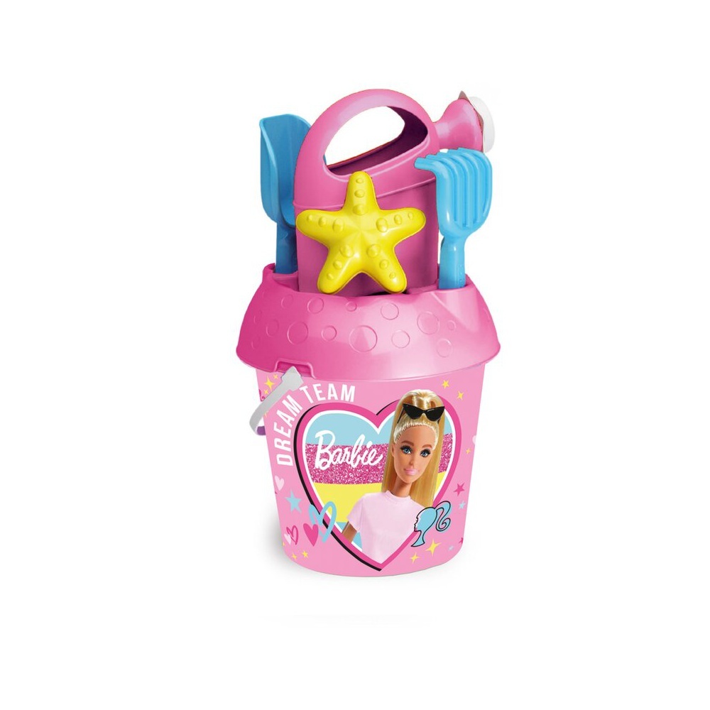 Obsah balení:Vědro s motivem Barbie - včetně odnímatelného víka se sítkemHráběLopatkaKonev na zaléváníForma na písek