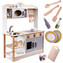 Materiál: MDF, plast, dřevoRozměry kuchyně: 68 cm x 25,5 cm x 85 cmVýška desky stolu (měřeno od podlahy): 37,5 cmPrůměr talíře: 11 cmDeska: 16,5 cm x 11 cmDélka příboru: cca 13 cmPrůměr hrnce: 9 cmVýška láhve: 8 cmRozměry balení: 92 cm x 30,5 cm x 15,5 cm Děti rády napodobují své rodiče, a proto stojí za to se zároveň naučit důležité domácí práce - a dřevěná kuchyňka na hraní s tím jistě pomůže!Kuchyňka je zárukou fantastické zábavy, při které budou moci děti v roli kuchařů rozvíjet své motorické a duševní schopnosti . Krájení, mixování, nalévání a pasení imaginárního jídla zlepší jemnou motoriku, dětské prsty získají sílu a přesnost.Hra s kuchyňkou bude pro vaše zákazníky také skvělým způsobem, jak svým dětem ukázat, jak zůstat při vaření v bezpečí - příprava jídel v dřevěné kuchyňce je zcela bezpečná!