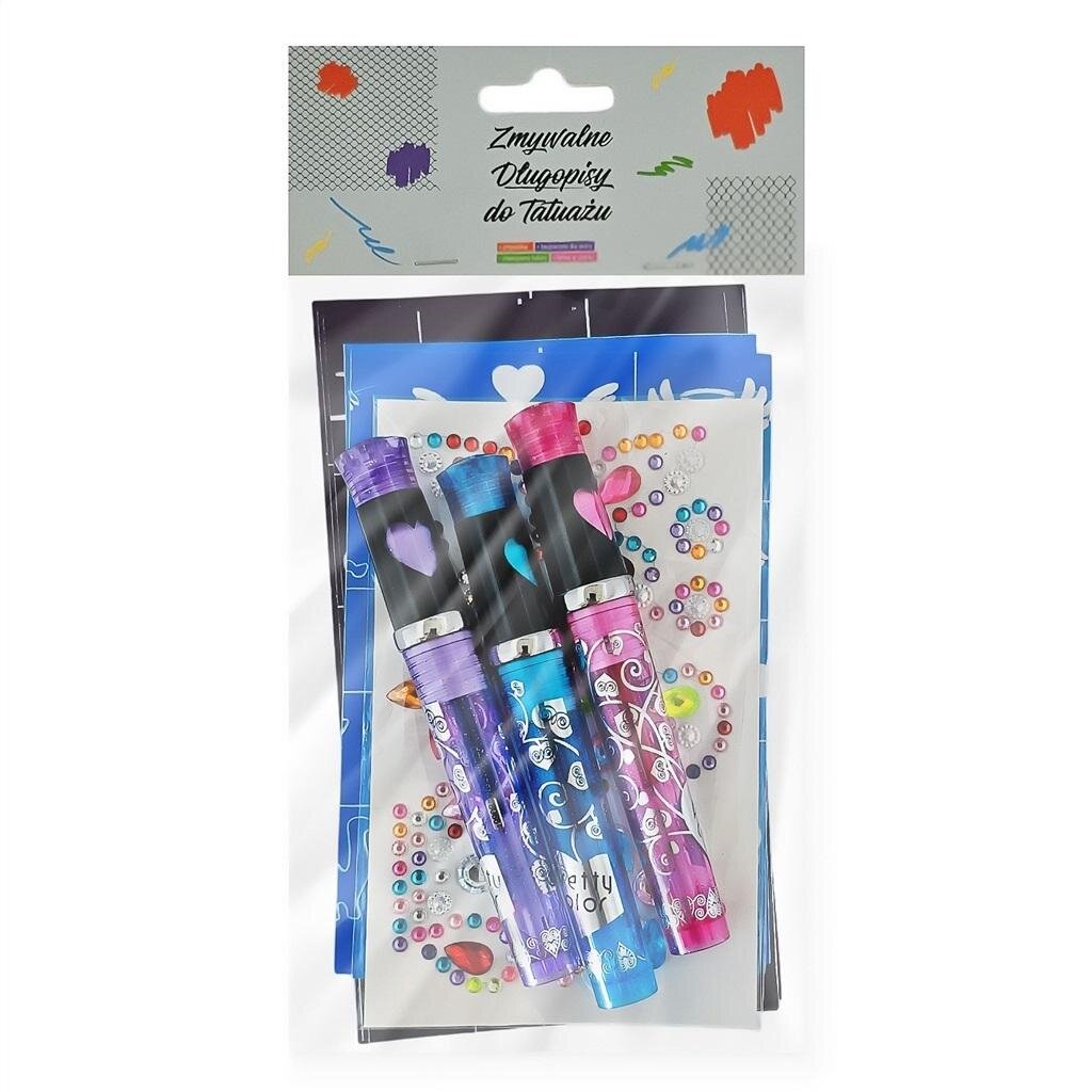 W zestawie: 3 kolory długopisów, 6 szablonów + tatuaże. číst celé