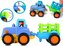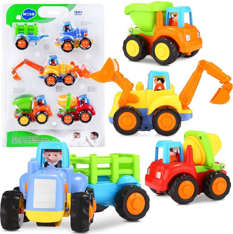 sada obsahuje 4 stavební vozidla s pohonem: míchačku na beton, sklápěč, bagr a traktor s přívěsem