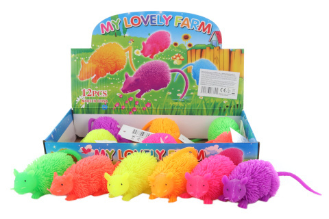 Gumová střapatá myš. Uvnitř je svítící kulička, která bliká. Rozměry cca 9,5 x 5 x 4,5 cm (bez ocasu). Věk 3+ číst celé