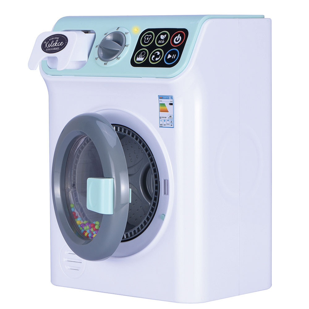 Potřebuješ rychle vyprat oblečení tvým panenkám? S naší moderní pračkou to není žádný problém! Pračka má dotykový panel, otevírací dveře a zásobník na prací prostředek. Po zapnutí pračka vydává reálný zvuk, svítí a otáčí se buben. Pračka o rozměrech 17,5 x 24 x 14 cm je vyrobena z kvalitního PVC a vyžaduje 3 ks baterií typu AA, které jsou součástí balení. Tato hračka je z kolekce luxusních dětských spotřebičů a je určena pro děti od 3 let. Baleno v krabici.