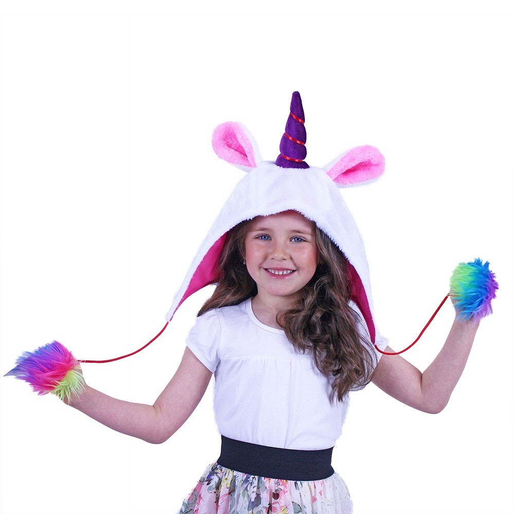 Senzační bílo - růžová plyšová čepice jednorožec s barevnými bambulkami a fialovým rohem. Super doplněk na karnevalovou párty! číst celé