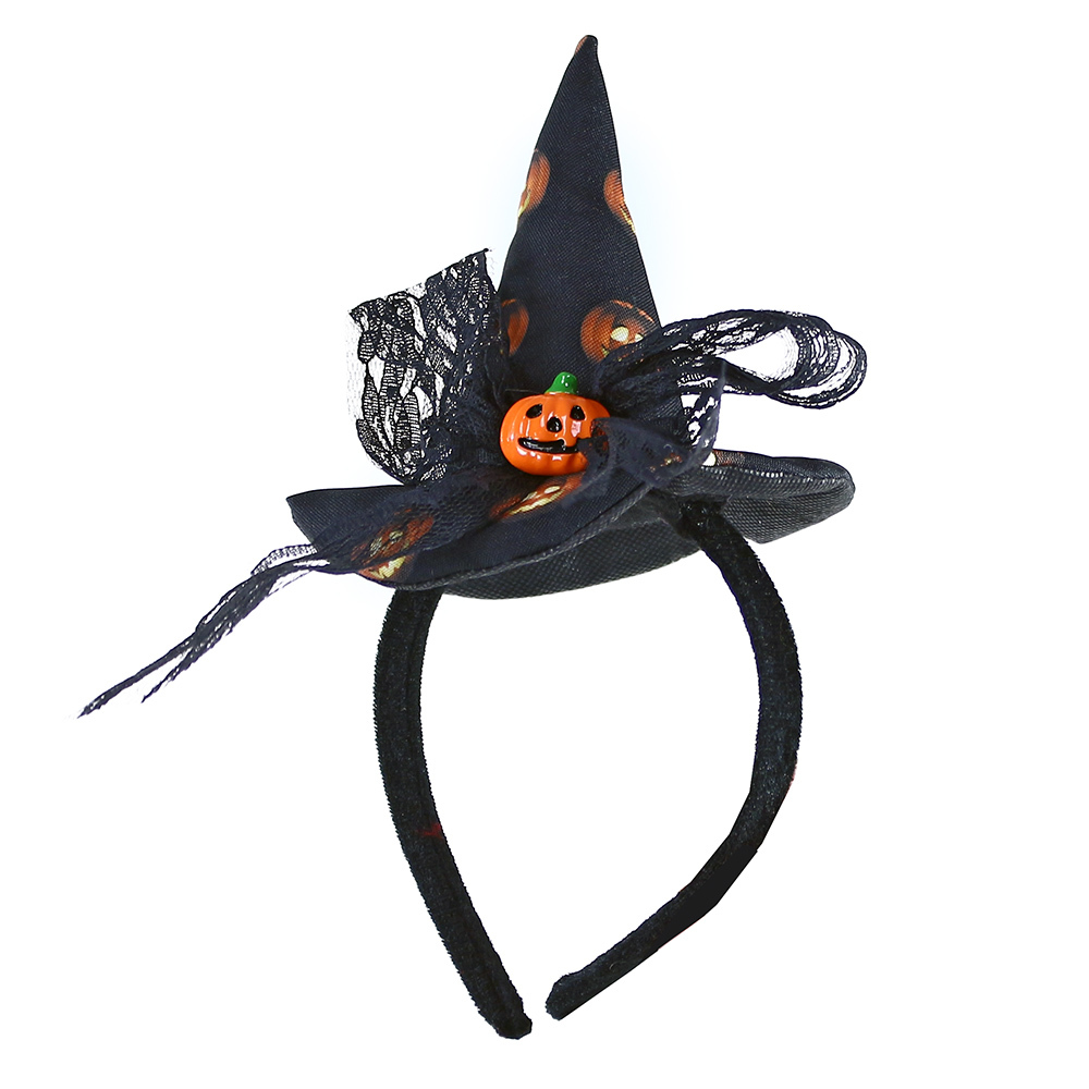 Elegantní mini klobouk v černé barvě s potiskem dýní, je zdobený černou krajkovou mašlí a malou dýní. Klobouk je upevněn na čelence. Ideální doplněk na halloweenskou párty nebo karneval. číst celé