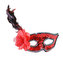 Červená elegantní škraboška na gumičku je zdobena flitry a lemována bílými zářivými kamínky. Na pravé straně je dekorována rudým květem a peřím. číst celé
