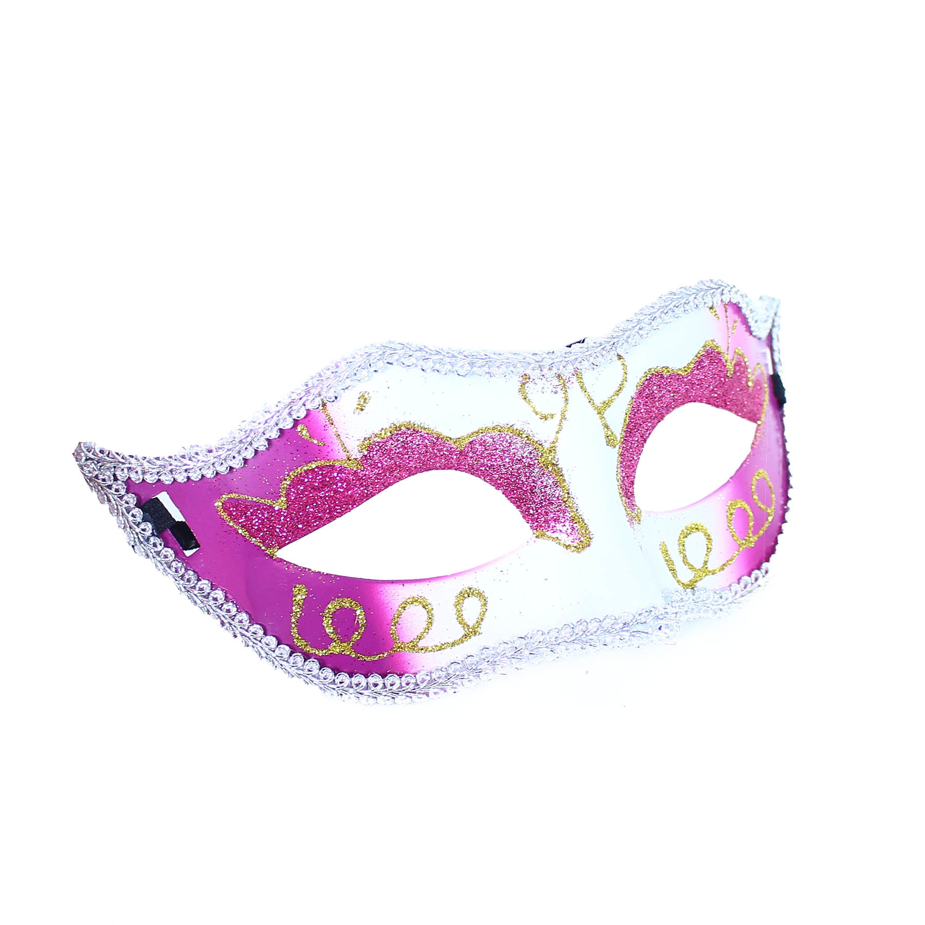 Růžovo-bílá elegantní škraboška na gumičku! Tento kousek je dekorován třpytivými malůvkami a lemován stříbrnou krajkou.