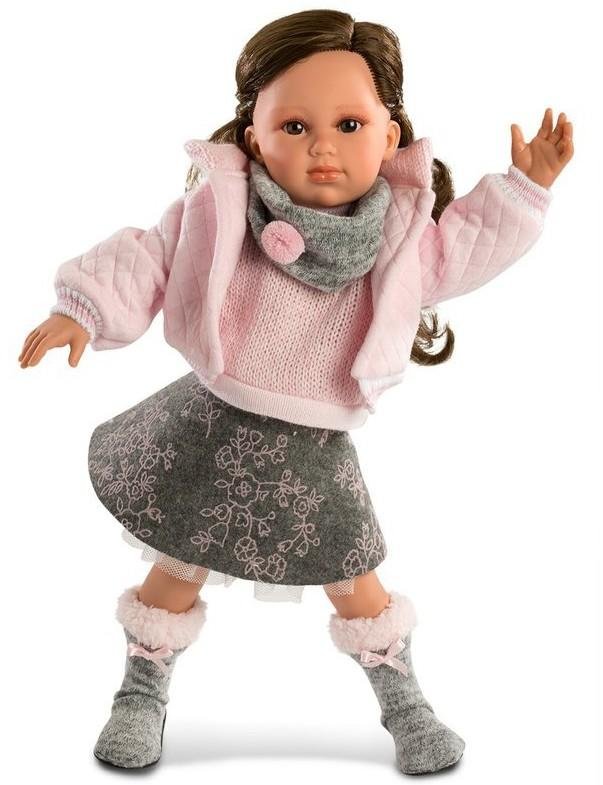 Kloubová panenka bez zvuku s vinylovým tělem a s vlásky po celé hlavě, podobající se malé slečně. Hlava, ruce a nohy jsou polohovací. Velikost 42 cm.