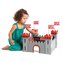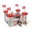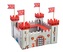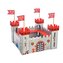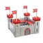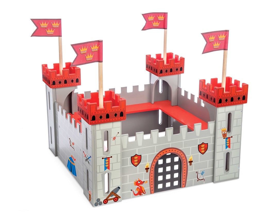 Dřevěný ručně malovaný hrad se čtyřmi červenými věžemi s vlajkami a padací branou.