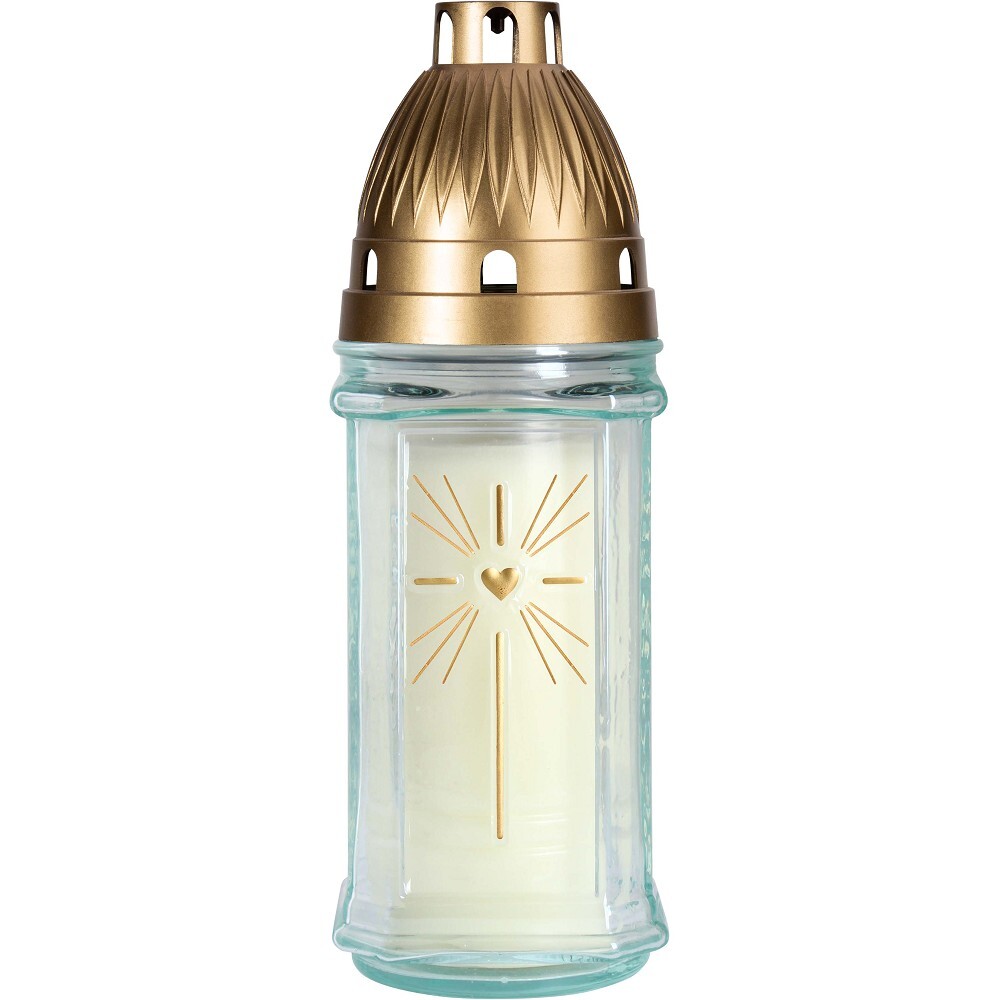 Svíčka Lucerna v čirém skle je ideálním doplňkem pro důstojné osvětlení hrobů či pietních míst. Díky pevnému víčku nezhasíná ani při větru, což zaručuje dlouhou trvanlivost a spolehlivost.