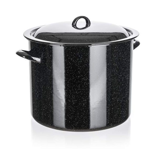 Smaltovaný hrnec s poklicí 17 l, rozměry: průměr 30 cm, výška 24 cm. Hrnec lze používat na všechny typy varných desek mimo indukce.