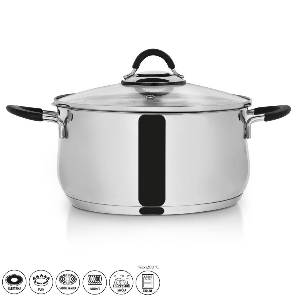Kastrol se skleněnou poklicí je skvělý pro každou moderní domácnost a je ideální cestou ke zdravé výživě, dietní, ekonomické a estetické přípravě pokrmů. Naakumulovaná energie předává teplo dále do nádoby - tepelný zdroj vypínáme v předstihu. Materiál: vysoce kvalitní nerezová ocel třídy 304, sklo, silikon - úchyty. Je vhodný na všechny typy spotřebičů včetně indukce, do trouby pouze bez poklice do 200 °C. Vhodný i do myčky nádobí. Rozměry: objem 5,3 l, pr. 24 cm, v. 12/18 cm.