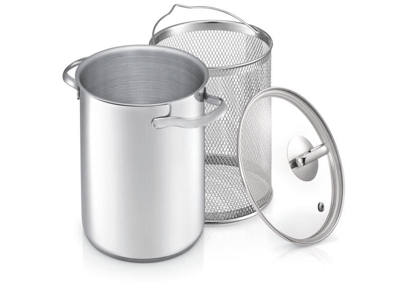 Nerezový hrnec s košem BEKA Speciality je vhodný na vaření zeleniny, chřestu i těstovin. Uvařené potraviny scedíte přímo vytažením síťové vložky z hrnce. Díky malému průměru a vhodné výšce jej využijete v každé domácnosti. Průměr 16 cm, objem 4,1 l. Součástí skleněná poklice s otvory pro únik páry a děrovaná vložka.Vhodné na všechny typy sporáků.