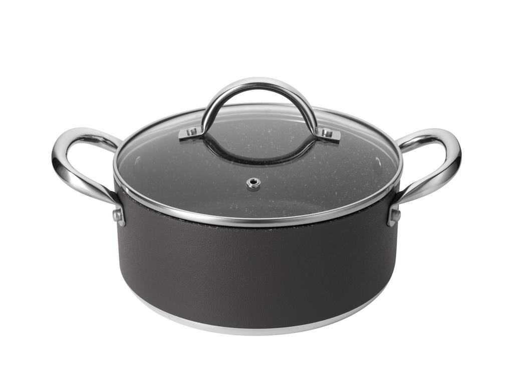 Hrnec 20 cm, objem 2,8 l; 2 vrstvý nepřilnavý povrch zesílený kamennou drtí, tvořící vzduchový polštář, díky kterému lze smažit v menším množství tuku; nerezové uchyty; vhodný na všechny typy varných desek včetně indukce; možnost použití v troubě při max. teplotě 130 °C; skleněná poklička číst celé