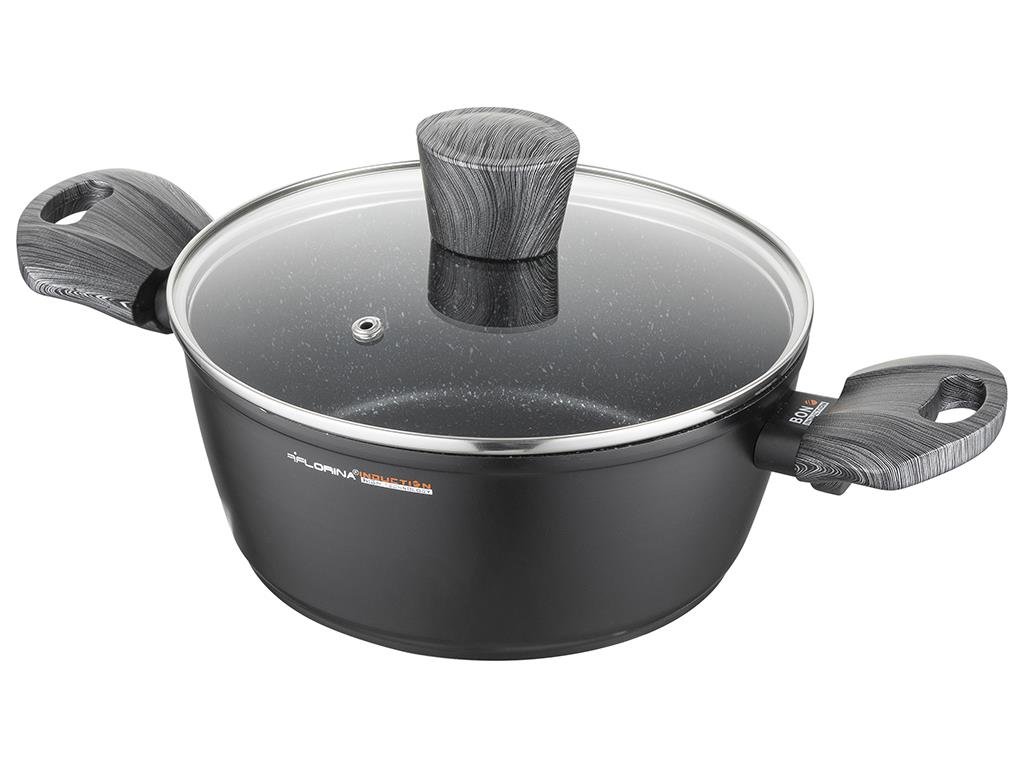 Hrnec 20cm, 2,5l, Specifikace: - Materiál: hliník - tloušťka 3,0 mm - nepřilnavý povrch, černý mramor skvrnitý stříbrnými částicemi - černý mat na vnější straně - Soft Touch rukojeť imitace dřeva - plná indukce