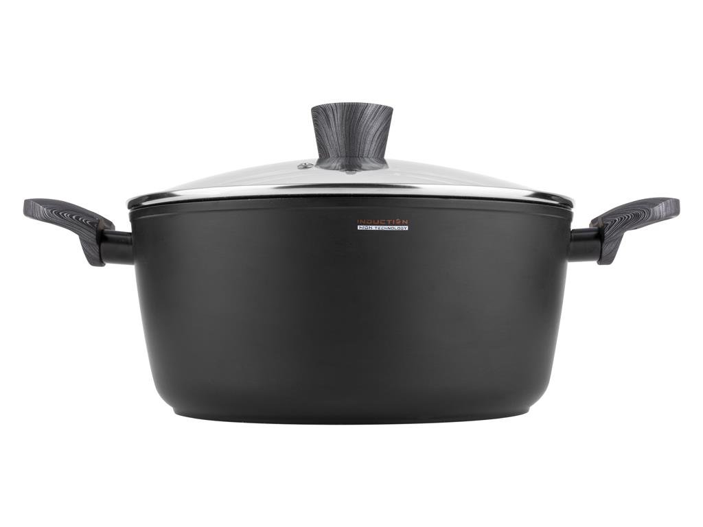 Hrnec o průměru 16 cm, objem 1,1 l Specifikace: - Materiál: hliník - tloušťka 3,0 mm - nepřilnavý povrch, černý mramor skvrnitý stříbrnými částicemi - černý mat na vnější straně - Soft Touch rukojeť imitace dřeva - plná indukce