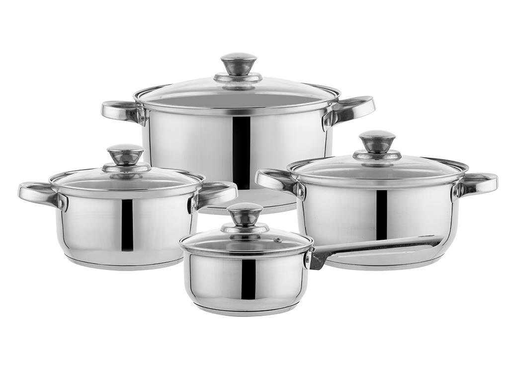 MATERIÁL: NEREZ 201; VNĚJŠÍ A VNITŘNÍ ZPRACOVÁNÍÍ: SATIN FINISH; Tloušťka stěny: 0,4MM; SLOŽENÍ SADY: RENDLÍK 16CM, HRNCE 18/20/24CM; VHODNÉ NA INDUKCI