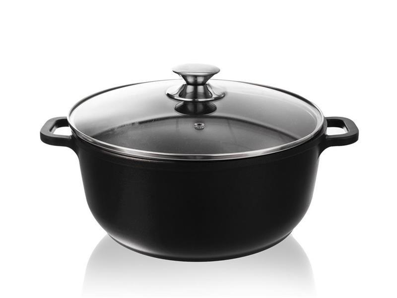 Masivní hrnec s poklicí s velmi kvalitním nepřilnavým povrchem PFLUON GRANIT. Můžete v něm vařit, smažit, dusit, opékat a zapékat s minimální potřebou tuku. Připravovaný pokrm se nepřipéká. Poklice s otvorem pro únik přebytečné páry. Vhodný na všechny typy spotřebičů včetně indukce i trouby. Materiál: hliník s vynikajícím nepřilnavým povrchem PFLUON GRANIT a s profilovaným dnem, sklo, nerez. Rozměry: objem 7 l, pr. 28 cm, v. 12,5/18 cm. Doporučujeme použití kuchyňské chňapky. U plynových sporáků volte správnou velikost plamene, u elektrických, sklokeramických a indukčních vařičů je nutné zvolit odpovídající velikost ploténky. Připravovaný pokrm lze na sporáku připravit a pak jej vložit do trouby. Připravené jídlo můžete pohodlně skladovat v hrncích také v chladničce. Při použití v troubě poklice max. do 200 °C. Lze mýt v myčce na nádobí.