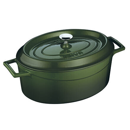 Hrnec litinový oválný, zelený, obsah 4,8 l, Ø 29 cmPraktický, vysoce kvalitní litinový hrnec, který můžete použít pro všechny typy sporáků, do trouby, na kamna i otevřený oheň. Hrnec má nepřilnavý povrch, rovnoměrně se prohřívá a dlouho udrží teplotu. Po nachlazení se může používat také na uchování chlazených potravin. Pěkný, moderní design dovoluje používat hrnec přímo k servírovaní. Mytí v myčce je možné, ale nedoporučuje se, neboť vlivem čistících prostředků používaných v myčce dochází ke snížení jasu barev. Při správném používání garantujeme dlouhou životnost hrnce.Litinové nádobí je velmi populární pro své vlastnosti, které jsou žádoucí při vaření, a to zejména:Rovnoměrné rozložení tepla: Litina má schopnost udržovat a rovnoměrně rozvádět teplo, což je ideální pro pomalé vaření, dusení a pečení.Zachování chutí: Litinové nádoby mohou přispět k bohatým chutím a aromatům pokrmů díky jejich schopnosti uchovávat a přenášet přírodní chutě surovin.Odolnost: Litinové hrnce jsou odolné a mohou posloužit po dlouhou dobu. Z trouby na stůl: Hrnec je navržen tak, mohl být přímo přenesen z trouby nebo sporáku na stůl.Zdravotní aspekty: Litina je také považována za zdravotně nezávadný materiál, který neuvolňuje do potravin žádné škodlivé látky.Parametry zeleného litinového hrnce o obsahu 4,8 l:materiál: smaltovaná litina třívrstvá, 2x pálenározměry: průměr 29 cmbarva: zelenáobsah: 4,8 ltloušťka materiálu: dno 5mm, stěny 4 mmvhodné pro všechny typy sporáků, možnost zapékání v trouběhrnec se prohřívá rovnoměrně, dlouho udrží teplotupo nachlazení hrnce lze používat i pro uchování chlazených potravinmoderní design - vhodné přímo k servírovánílze mýt v myčce, ale nedoporučuje se, neboť dochází ke zhoršení jasu barevpři správném použití zaručujeme dlouhou životnost hrnce