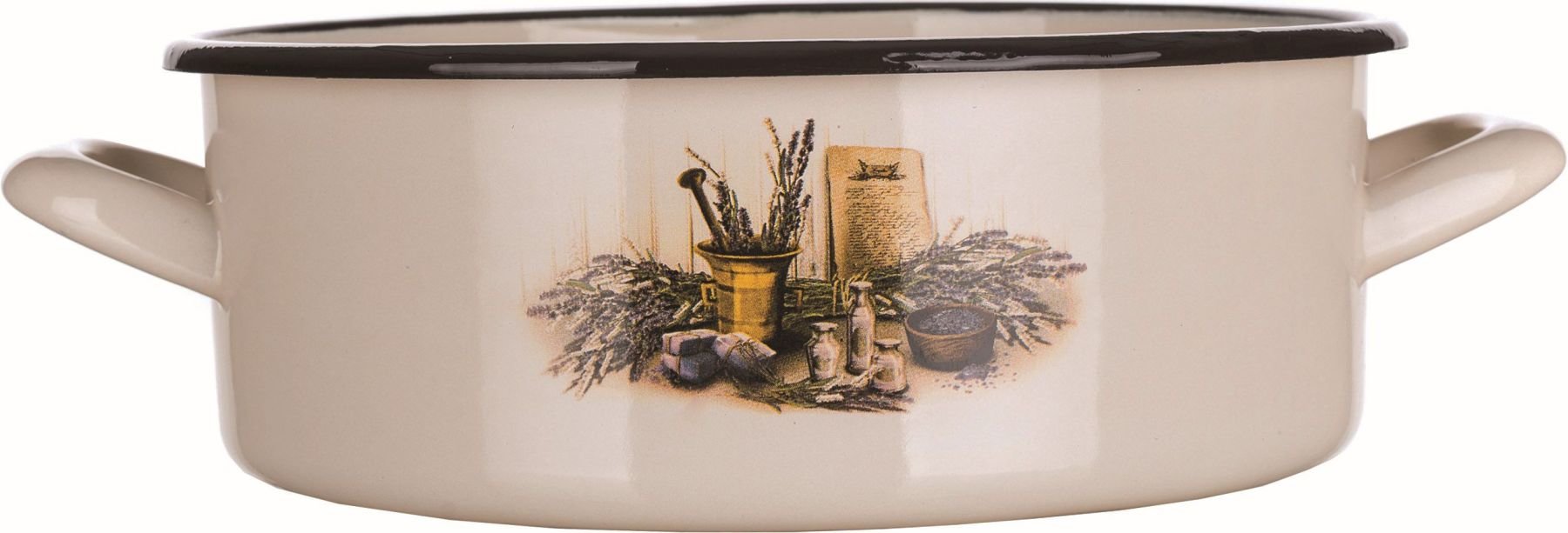 Kastrol smaltovaný LAVENDER 1,2 l - 2vrstvý smaltovaný vnitřní a vnější povlak s dekorem LEVANDULE, rolovaný okraj. Vhodný na všechny typy varných ploch včetně indukce. Lze použít do myčky nádobí. Rozměry - průměr 16 cm, výška 7 cm, tloušťka stěn 0,8 mm.