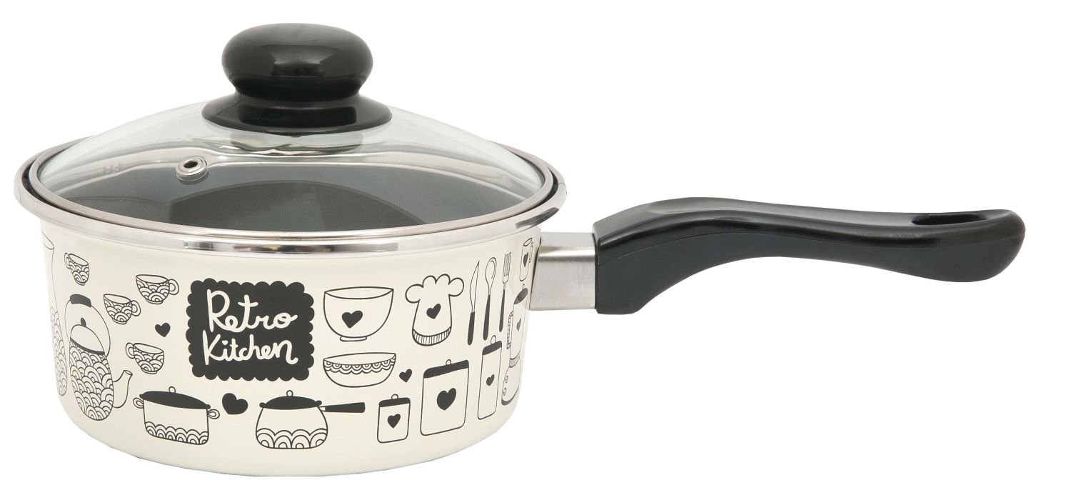 Smaltovaný rendlík se skleněnou poklicí a plastovou rukojetí o objemu 1,5 l s retro motivem. Materiál - smalt, sklo, plast. Rozměry - výška 13 cm, průměr 17 cm, délka i s rukojetí 33 cm. Lze ji použít na všechny typy varných ploch. Lze ji mýt v myčce nádobí.
