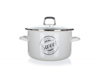 Smaltovaný hrnec o rozměru 22 x 13 cm v bílé barvě s dekorem SWEET HOME je vhodný na vaření různých pokrmů. Hrnec má skleněnou poklici opatřenou nerezovým okrajem a nerezový knob se silikonovou povrchovou úpravou. V nabídce máme další produkty z kolekce SWEET HOME.