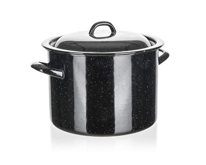 Smaltovaný hrnec s poklicí 3 l, rozměry: průměr 18 cm, výška 14,5 cm. Hrnec lze používat na všechny typy varných desek mimo indukce.