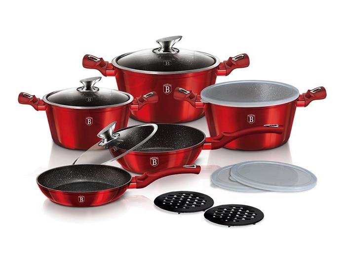 Vyjímečná sada nádobí značky Berlingerhaus edice Burgundy Metallic Line se skládá celkem ze 13 kusů nádobí a kuchyňského