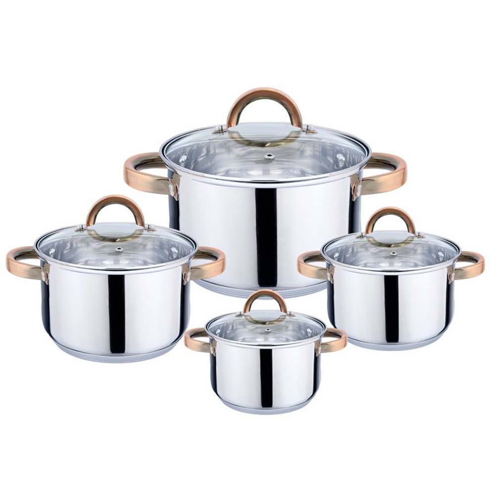 Sada nerezového nádobí 8 dílná. Vyrobeno z prvotřídní nerezové oceli. Sendvičové dno pro rovnoměrný a rychlý ohřev. Speciálně tvarované okraje hrnců usnadňuí rozlévání bez rozstřikování. Skleněné poklice opatřeny otvorem pro únik páry. Vhodné pro všechny druhy spúoráků včetně indukce.