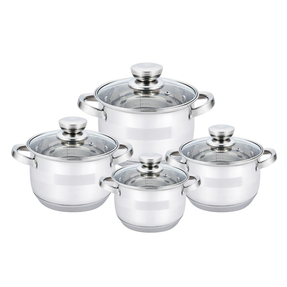 Sada nerezového nádobí 8 dílná. Povrch v kombinaci matné a lesklé barvy. Sendvičové dno pro rovnoměrný a rychlý ohřev. Speciálně tvarované okraje hrnců usnadňuí rozlévání bez rozstřikování. Skleněné poklice opatřeny otvorem pro únik páry. Vhodné pro všechny druhy spúoráků včetně indukce.
