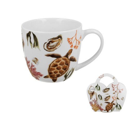 Kubek 460 ml w "koszyczku" ŻÓŁW wchodzący w skład serii Seaside, charakteryzuje się naturalnym kremowo-białym kolorem z delikatnym połyskiem oraz wyjątkową wytrzymałością i trwałością, zachowując lekkość i finezję.