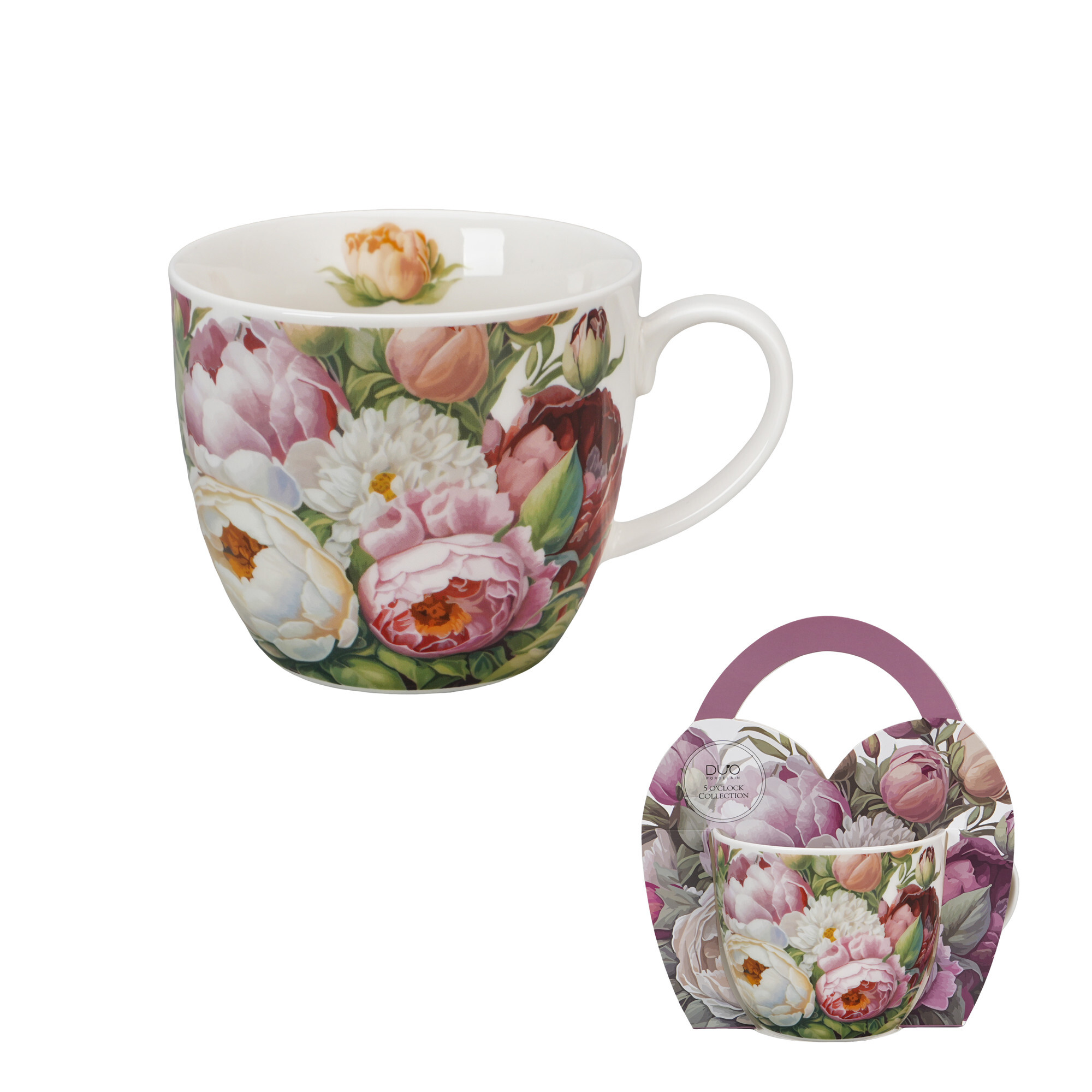 Kubek 460 ml w koszyczku PIWONIE wchodzący w skład kolekcji Kwiaty Classics, wykonany z porcelany New Bone China, charakteryzującej się elegancką i naturalną kremowo - białą barwą z delikatnym połyskiem a także wyjątkową wytrzymałością przy zachowaniu lekkości i delikatności.