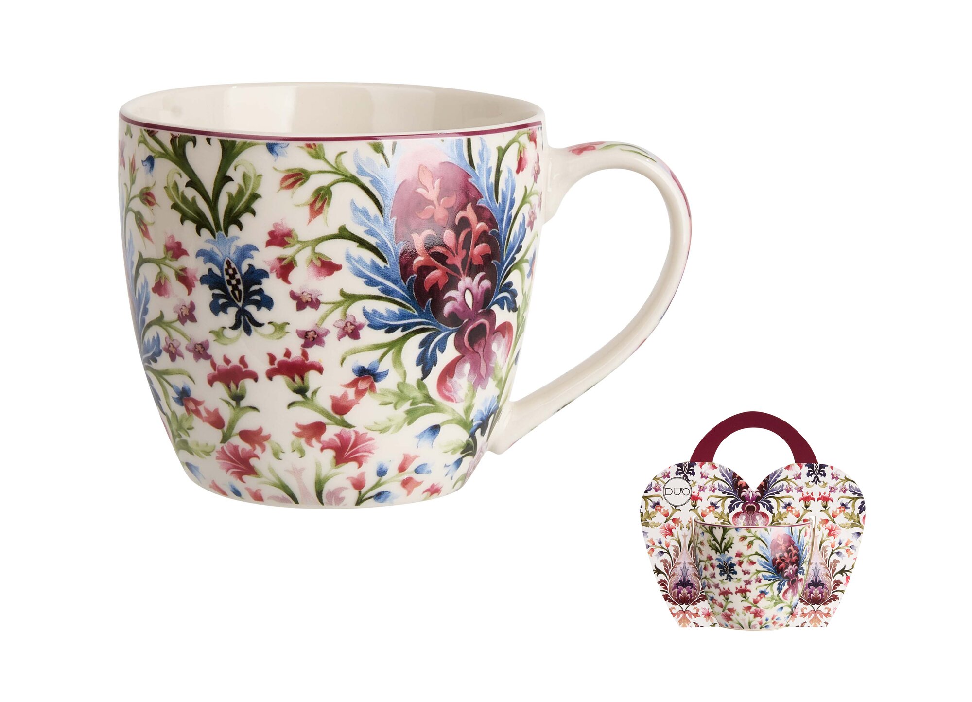 Kubek 460 ml w „koszyczku” MARBELLA wchodzący w skład linii ETHNIC, wykonany z porcelany New Bone China, charakteryzującej się elegancką i naturalną kremowo - białą barwą z delikatnym połyskiem a także wyjątkową wytrzymałością przy zachowaniu lekkości i delikatności.