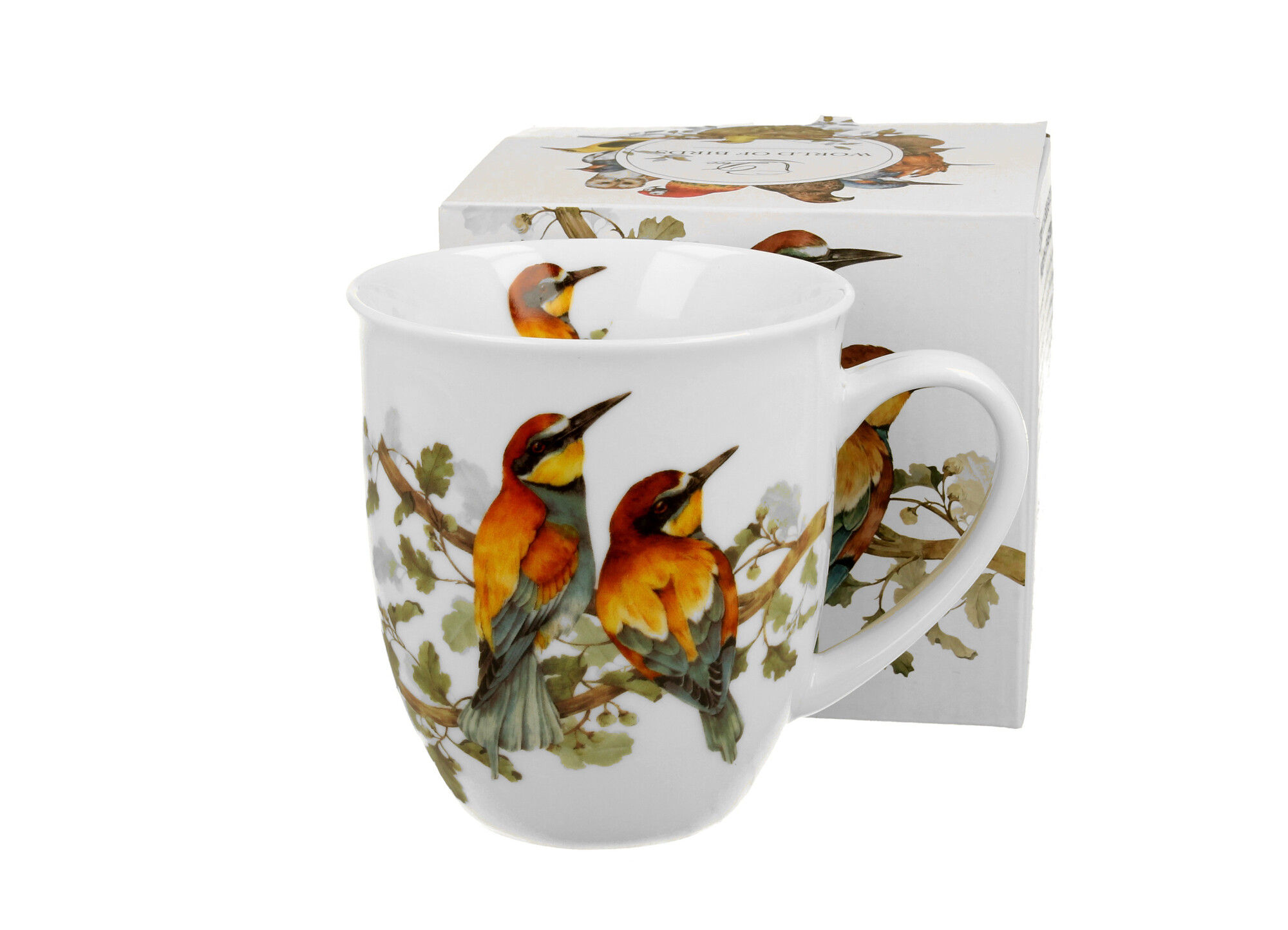 Kubek zdobiony motywem malutkich, kolorowych żółn siedzacyh na liściastej gałązce. Soczyste kolory ptaszków w połączeniu z pastelową zielenią tworzą wyjątkowo miłą dla oka kompozycję.