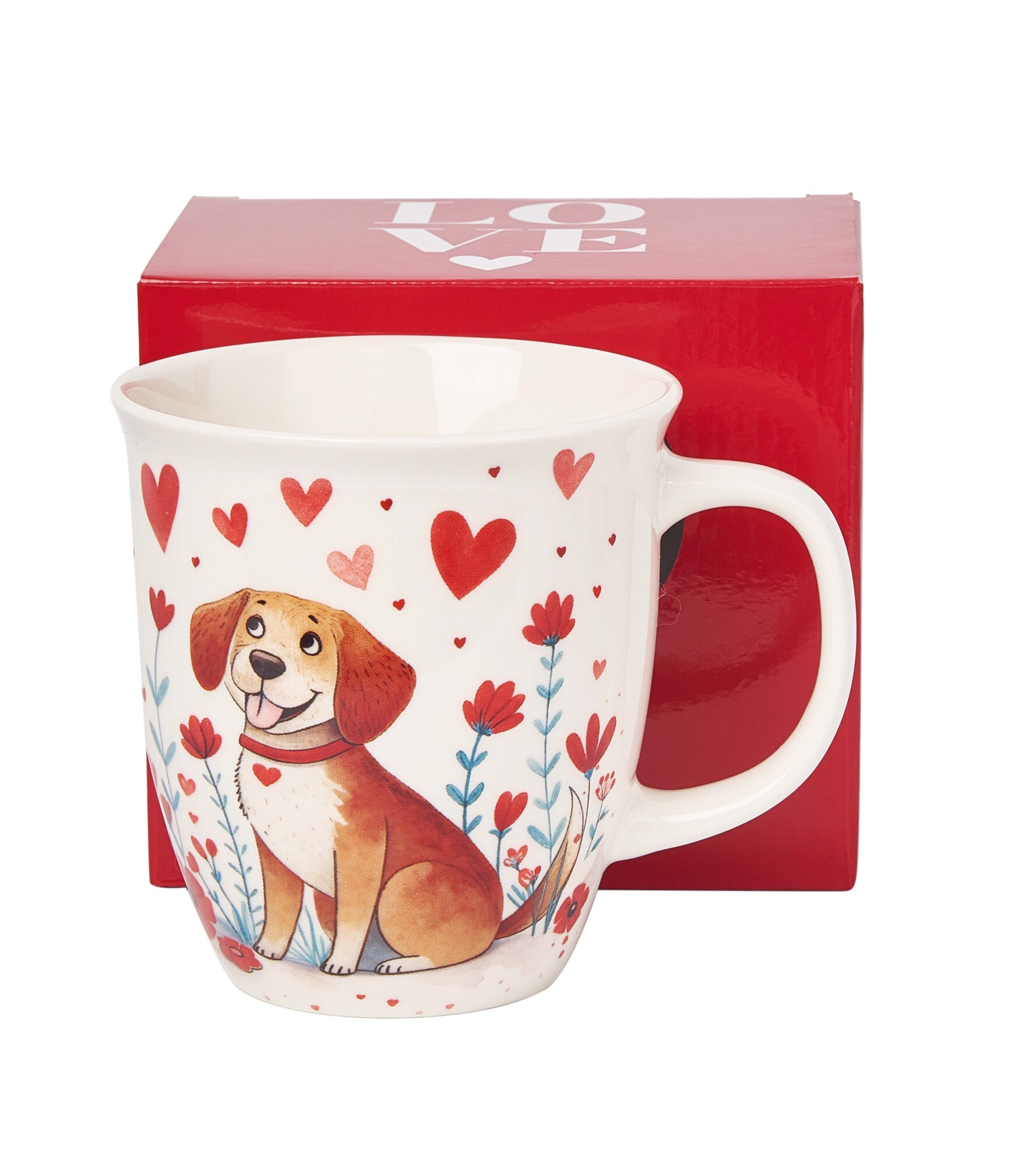 Linia zdobiona motywem wesołego psa na kwiecistej łące w otoczeniu unoszących się w powietrzu czerwonych serduszek.