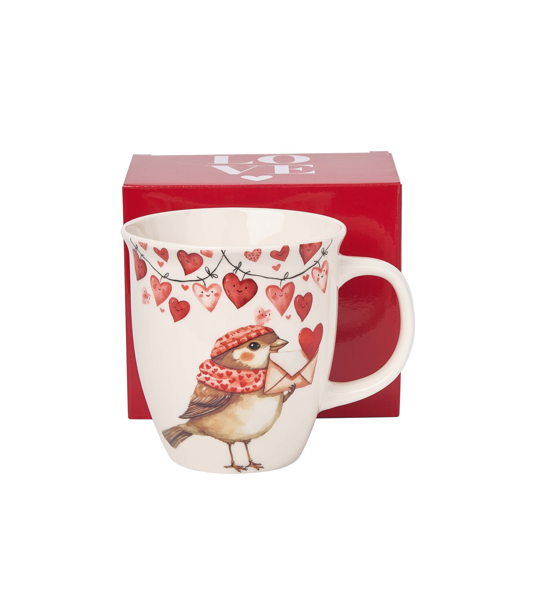 Linia zdobiona motywem uroczego wróbla w zimowej czapeczce i szaliku w otoczeniu czerwonych serduszek.