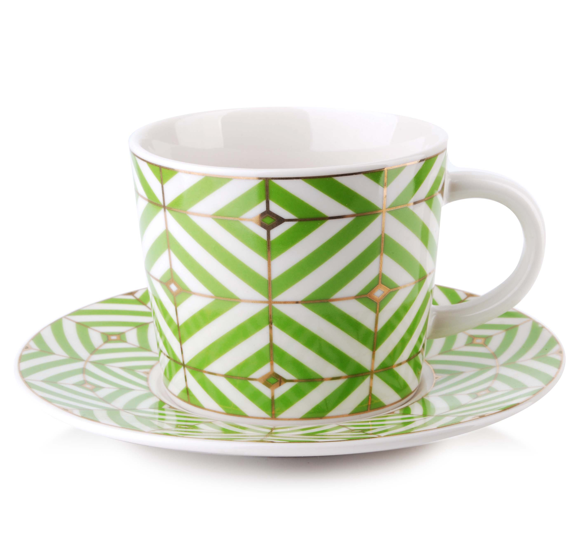 Porcelanowa filiżanka ze spodkiem ZOE marki Affek Design. Pojemność: 240ml. Zdobiona miętowo-złotym wzorem - nie nadaje się do zmywarki. Wymiary: średnica spodka:15.4cm wysokość spodka:1.5cm wysokość filiżanki:7cm Średnica filiżanki z uchem:11cm średnica filiżanki bez ucha:8.7cm