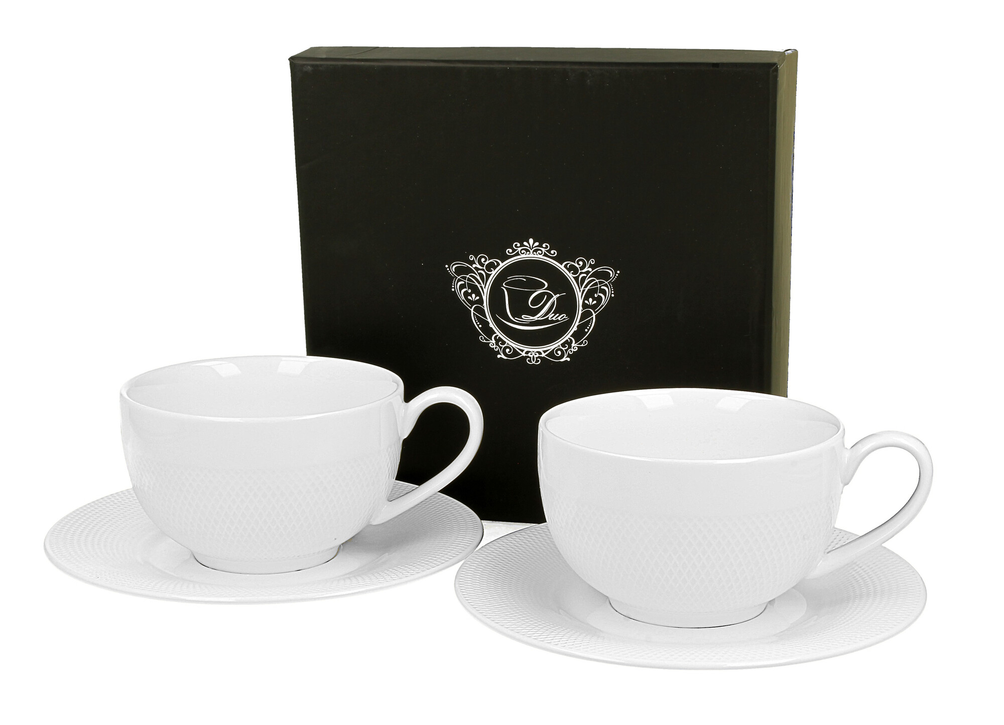 Komplet 2 filiżanek ze spodkami DIAMOND wchodzący w skład kolekcji BIAŁEJ. Zastawa stołowa wykonana z wysokiej jakości wzmocnionej porcelany Durable w kolorze białym z delikatnym połyskiem, wyróżniająca się wyjątkową wytrzymałością.