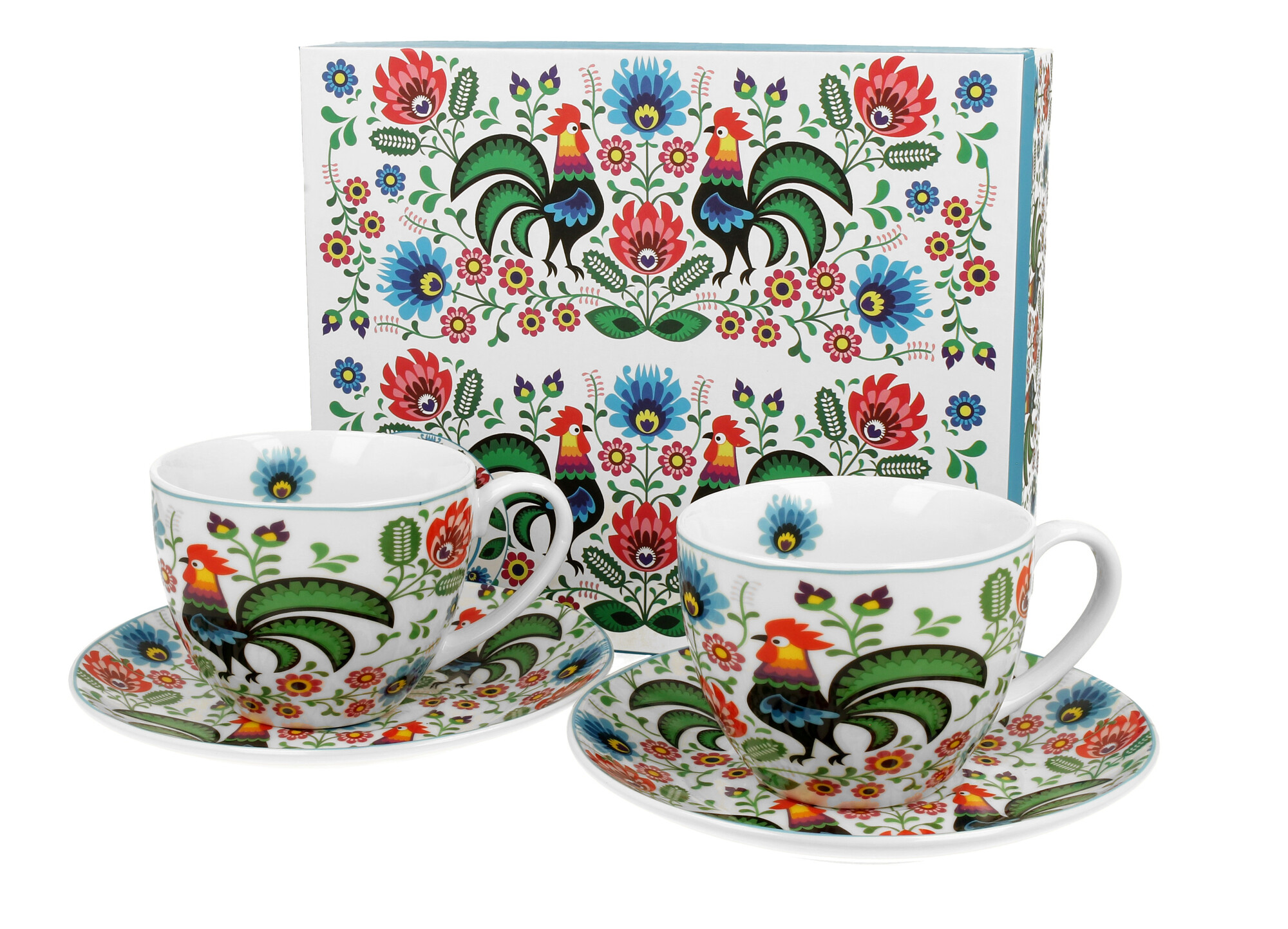 Komplet dwóch filiżanek ze spodkami KOGUTY FOLK wchodząca w skład serii ETNO, wykonana z porcelany New Bone China, która charakteryzuje się naturalnym kremowo-białym kolorem z delikatnym połyskiem oraz wyjątkową wytrzymałością i trwałością, zachowując lekkość i finezję.