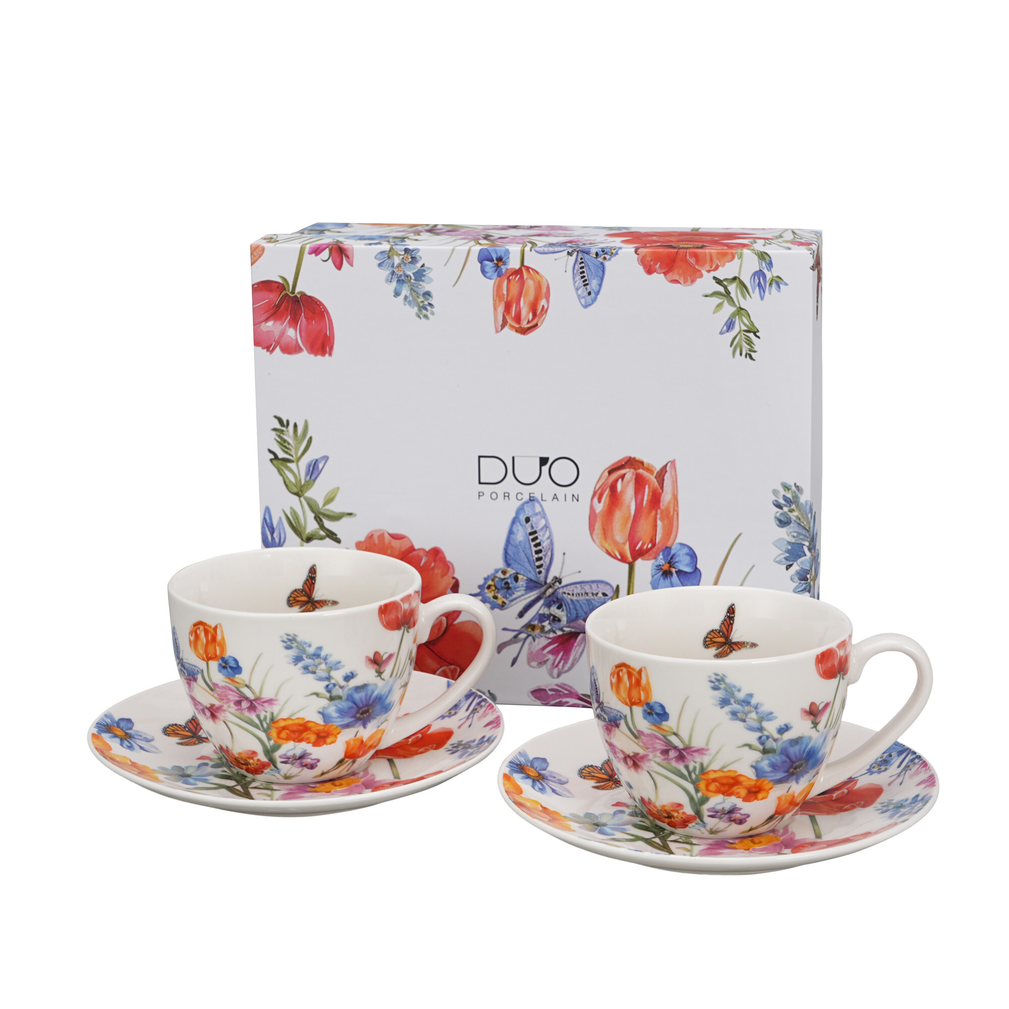 Komplet dwóch filiżanek ze spodkami SPRING wchodzący w skład linii Kwiaty Classic wykonany z porcelany New Bone China, która charakteryzuje się naturalnym kremowo-białym kolorem z delikatnym połyskiem oraz wyjątkową wytrzymałością i trwałością.