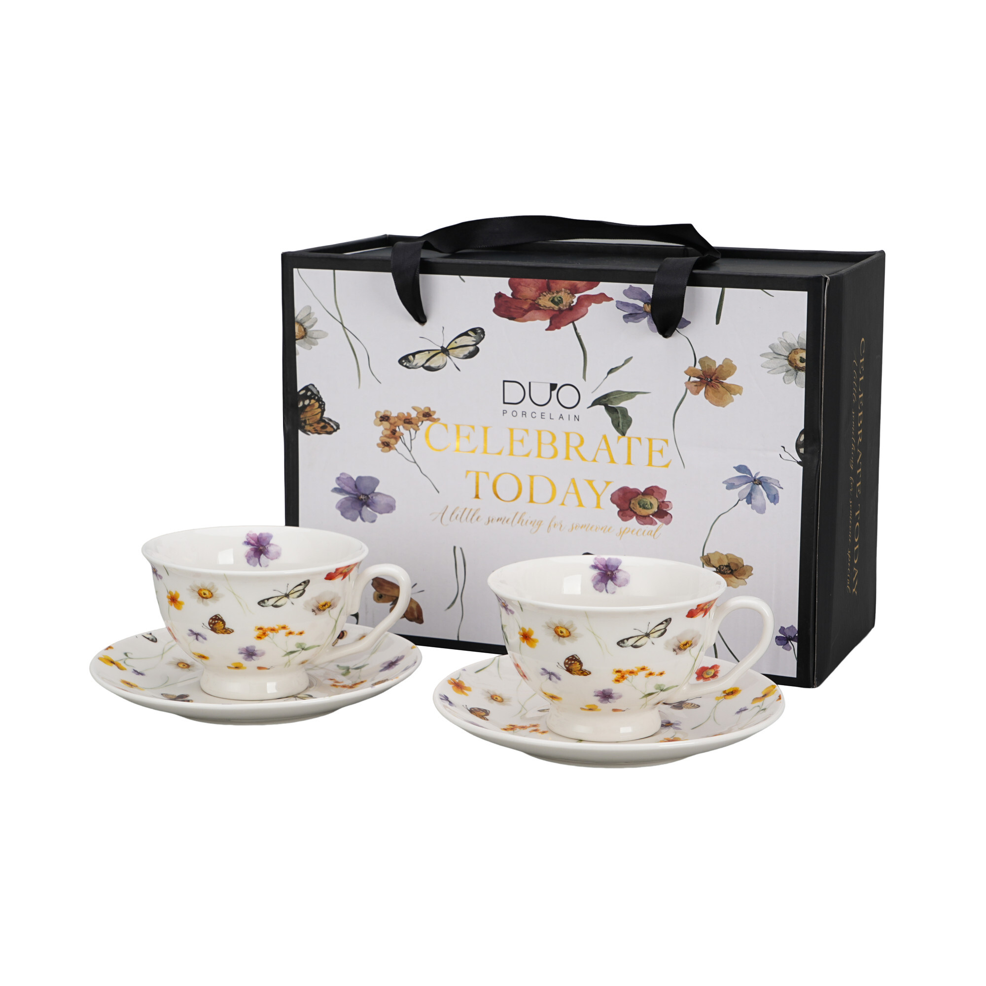 Komplet dwóch filiżanek royal ze spodkami MARGARET wchodząca w skład serii Kwiaty Royal, wykonany z porcelany New Bone China, charakteryzującej się elegancką i naturalną kremowo - białą barwą z delikatnym połyskiem, a także wyjątkową wytrzymałością.
