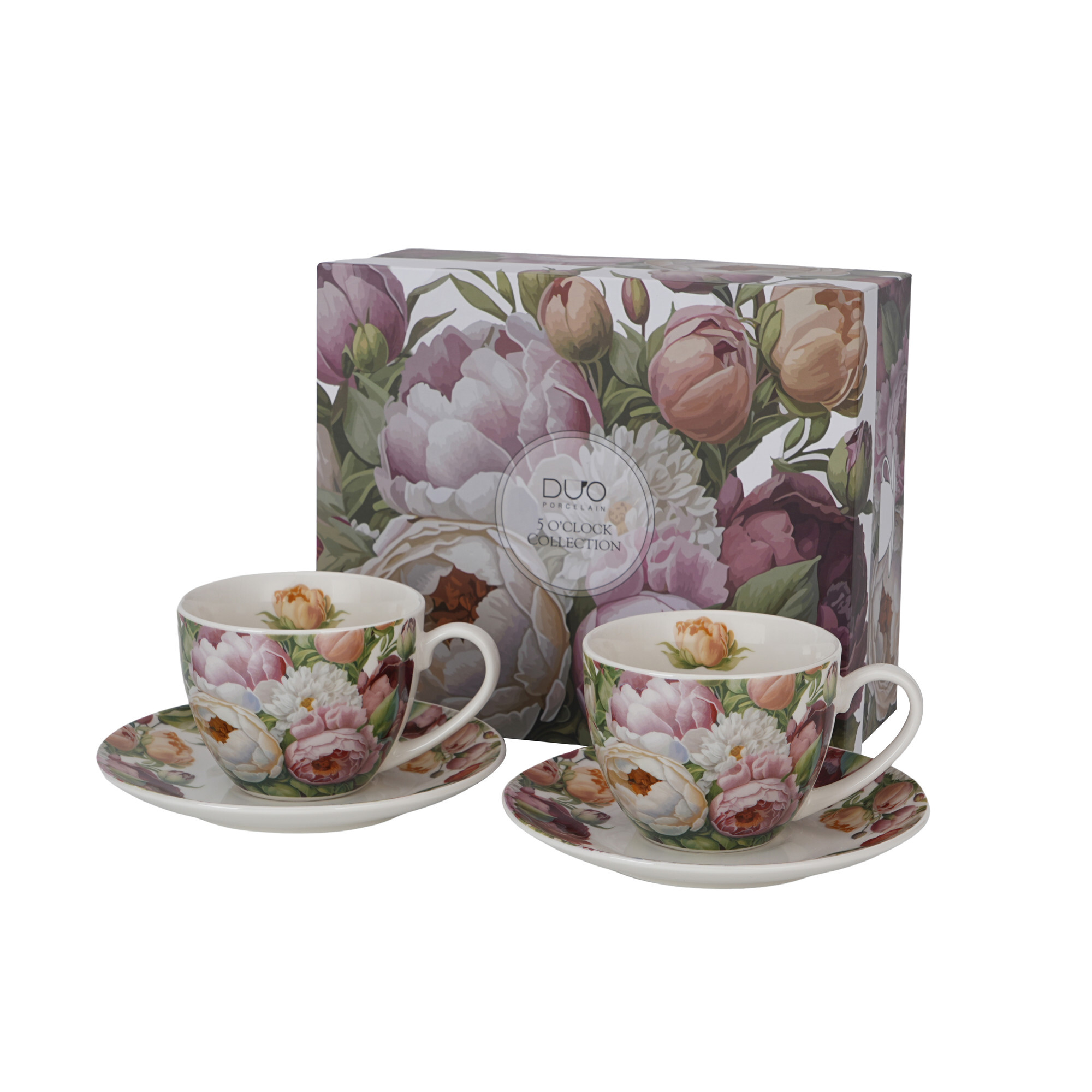 Komplet dwóch filiżanek ze spodkami PIWONIE wchodzący w skład kolekcji Kwiaty Classics, wykonany z porcelany New Bone China, charakteryzującej się elegancką i naturalną kremowo - białą barwą z delikatnym połyskiem a także wyjątkową wytrzymałością przy zachowaniu lekkości i delikatności.