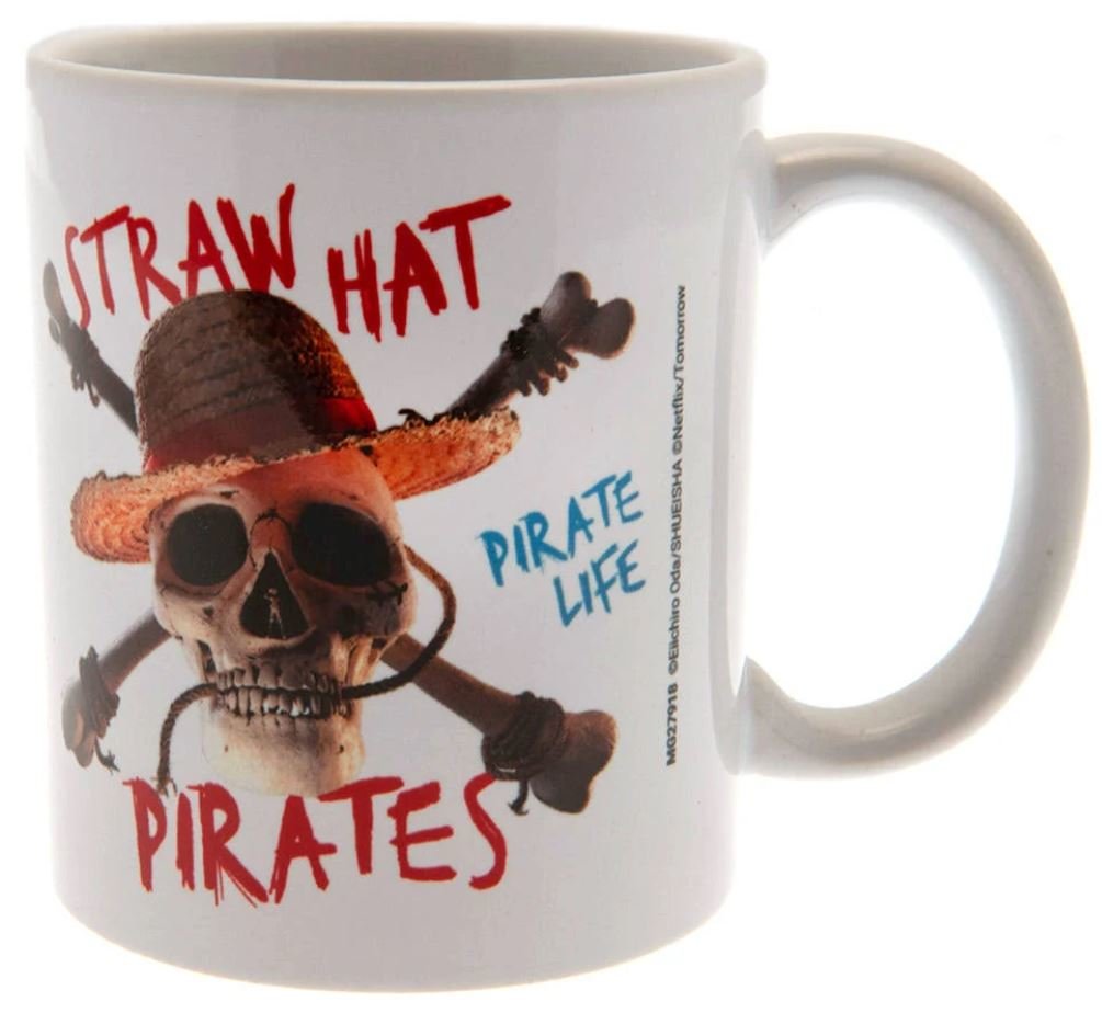 Bílý keramický hrnek s grafikou živé akce a lebky s pirátským sláměným kloboukem se znakem mangy One Piece, kterou vytvořil mangaka Eličiró Oda. Příběh vypráví o chlapci jménem Monkey D. Luffy, který má velký sen, a to stát se novým pirátským králem. Hrnek je vhodný pro všechny menší i větší piráty.