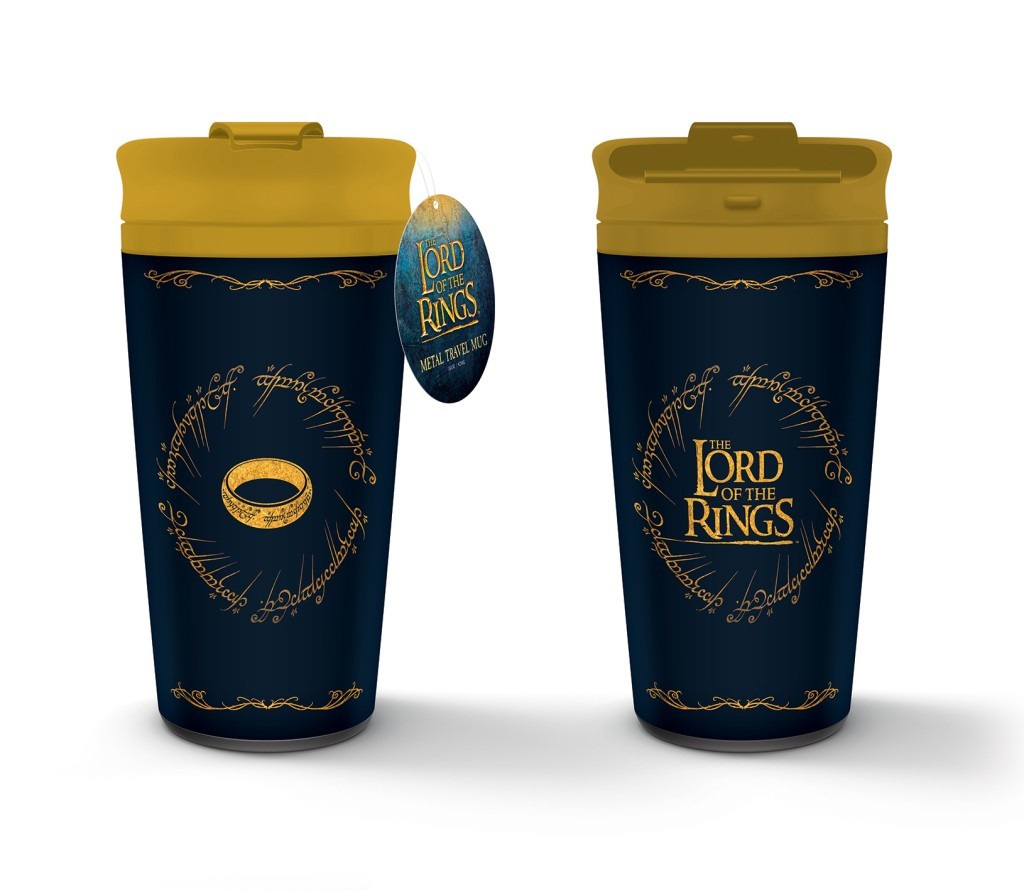 Kovový cestovní hrnek pro fanoušky Pána prstenů zdobí Prsten moci a nápis v sindarštině. Skvělý hrnek nejen na výlet do Středozemě! Produkt není vhodný do myčky ani mikrovlnné trouby. Materiál: kov