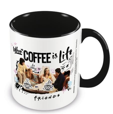 Černý keramický hrnek s logem, motivem postav a textem: Coffee is Life, ze seriálu Přátelé.